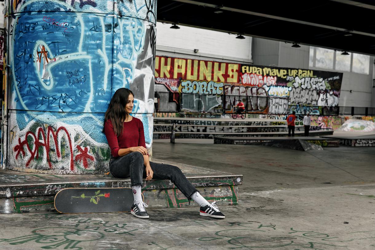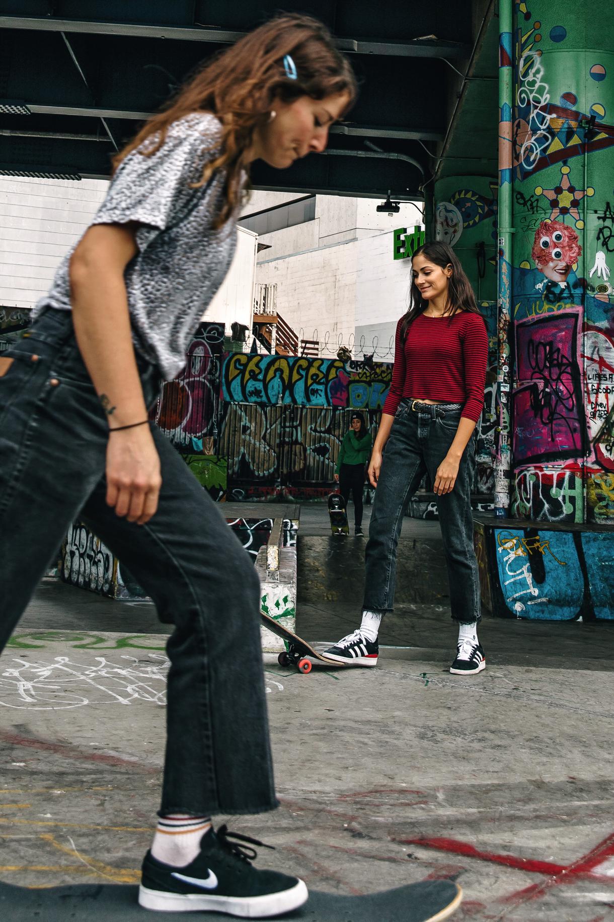 Sabrina: No, yeah. I was so intimidated. I thought it would be like, Oh, we’ll just take a picture. And then she started hitting me up to skate, and I was like, She wants to skate with me? No way! I always feel that way, especially with people who are so good that I really look up to them. Like, why do you want to skate with me? But I think it’s because we all really thrive on that hype and that energy. So, that’s how we’ve built communities. Every time I see a girl at the skate park, I don’t care if I know her or not. I’m like, “Yes, get it! You’re amazing!” And then we’ll figure out if we’re friends later.