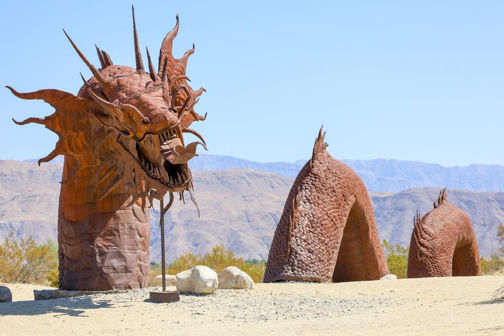 As you meander down State Route 3, keep an eye out for a majestic horse striking a pose near the roadside. Suddenly, an elephant seems to emerge from the expansive desert, followed by the thrilling sight of a T-Rex in hot pursuit of a saber-tooth tiger. Rest assured, your eyes aren't deceiving you—this isn't a desert illusion but a fascinating display of desert art. These captivating sculptures, scattered across Anza-Borrego Desert State Park, are the imaginative creations of Ricardo Breceda, a talented artist and metalworker. Located a mere two-hour drive east of San Diego, this spot offers a surreal and unexpected art experience amidst the arid landscape.
