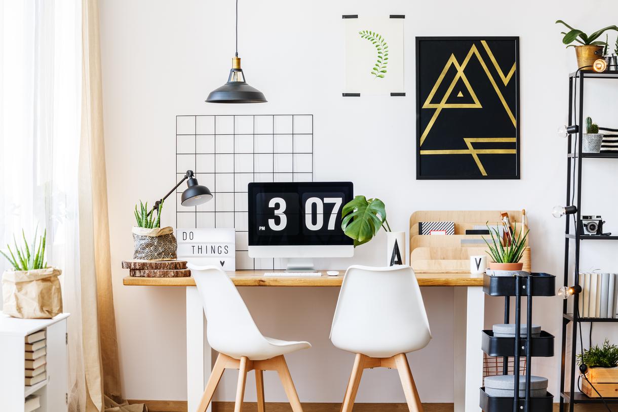 Styling a farmhouse office creates a cozy vibe for your everyday life. Pale woods, neutral colors, bulky furniture, and bold patterns take you back to simpler times when your only summer plan was playing in the barn. Sometimes, refurbishing means reducing your carbon footprint by upcycling—head to your nearest antique store to find new pieces for your refurbished home space. Paint the furniture, check the attic (or storage space) for grandma’s warm knitted blanket, and acquire a station clock to keep track of your next meeting.