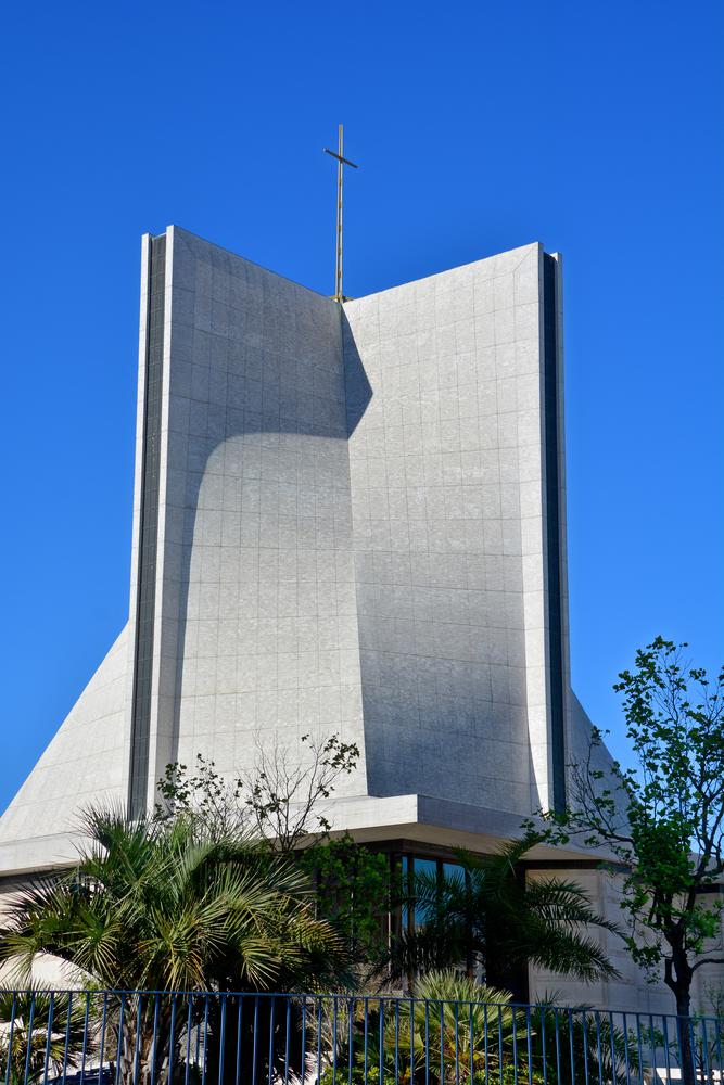 The Cathedral of Saint Mary of the Assumption stands 190 feet high and features a 55-foot golden cross on top. There are eight segments of hyperbolic paraboloids on its saddle roof; this creates the illusion that the bottom horizontal cross-section of the roof is a square and the top cross-section is a cross.