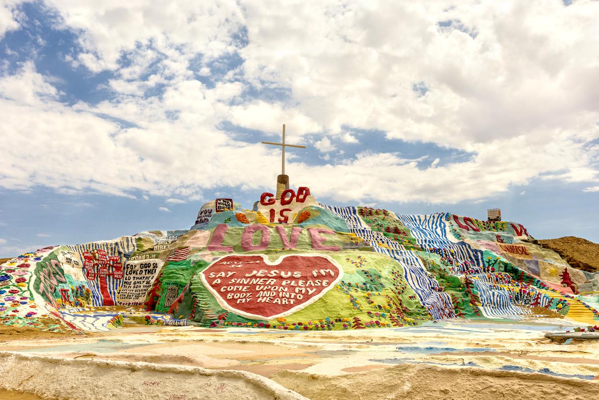 Another noteworthy colorful place in California is Salvation Mountain, a massive open-air visionary art environment that is made mostly of adobe bricks and covered with thousands of gallons of paint. Created by Leonard Knight in 1984, the original Salvation Mountain was destroyed due to a rainstorm. Not to be deterred, in 1989 Knight began construction on a new Salvation Mountain which stands to this day. Salvation Mountain is considered a central piece of American folk art with a prominent religious message of unconditional love for all humankind.